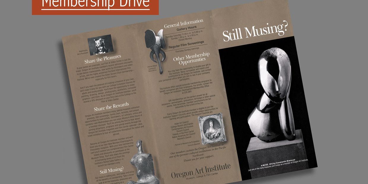 Working with Reed Harris Direct Mail, Frank designed and created the marketing program for the Oregon Art Institute's Museum, College and Film Center's membership drive. The theme of the campaign took its lead from one of the museum's signature pieces, A Muse, 1912 by Constantin Brancusi – "Still Musing" about becoming an Oregon Art Institute Member? Join today.